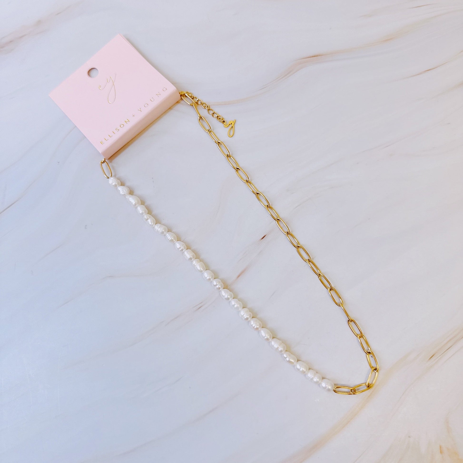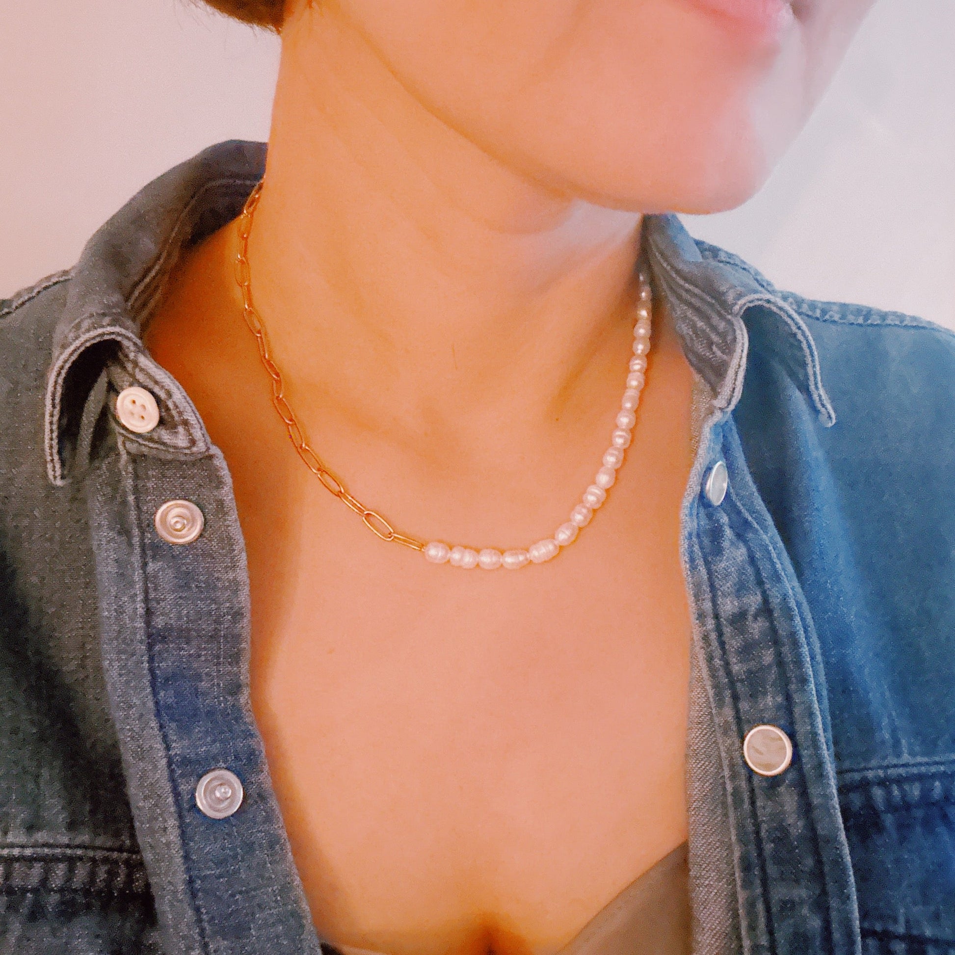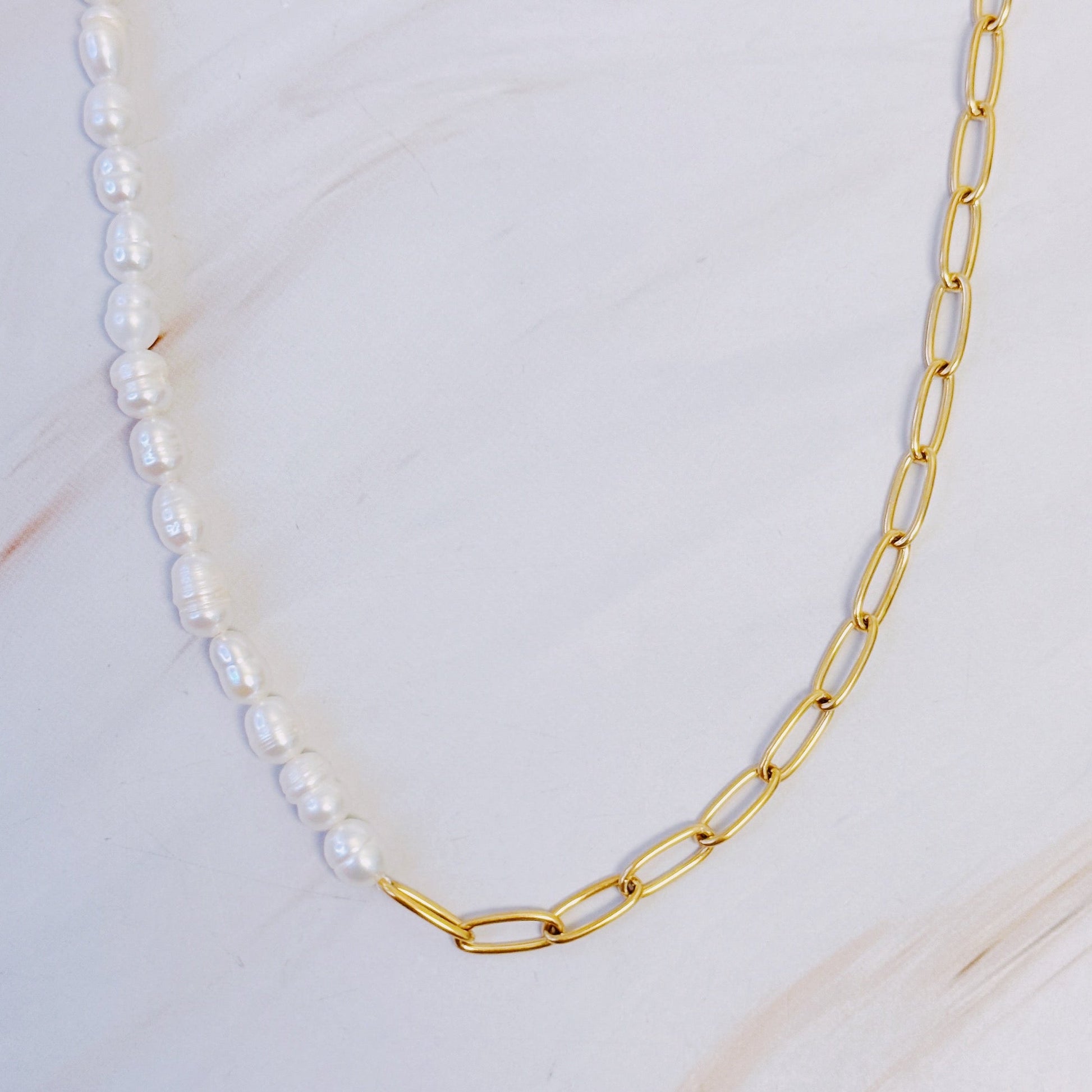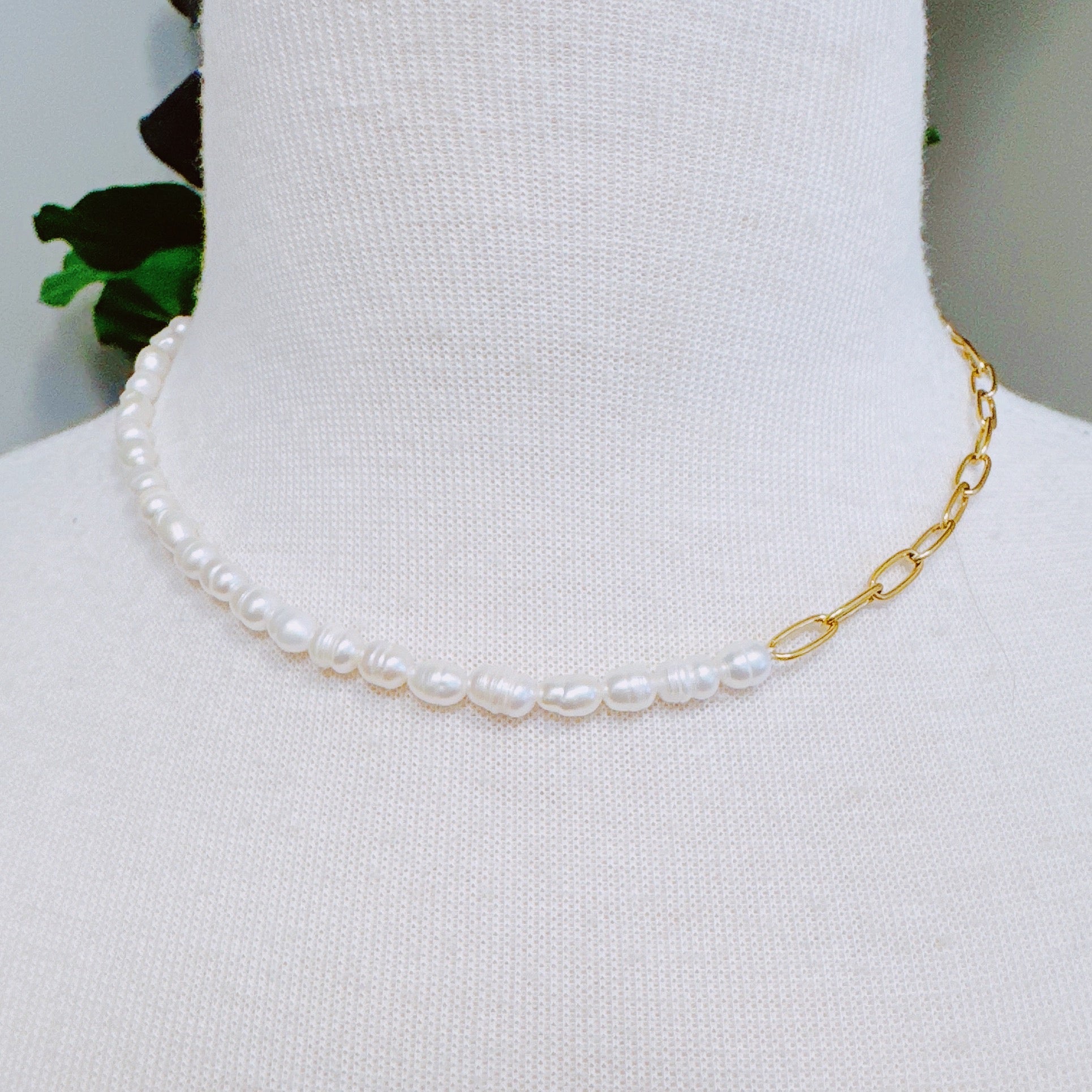 This elegant necklace features stunning freshwater pearls paired with a modern and edgy chain design. Combining beauty and edge, it adds a touch of sophistication to any outfit.